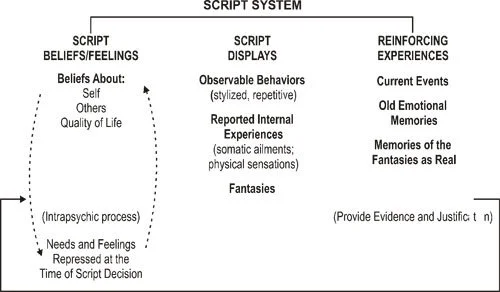 The script system . . . provides a model for understanding the systematic dynamics among the intrapsychic, behavioral, and physiological dimensions of life script. The script system diagrams how the intra psychic reactions (defensive conclusions and decisions) and introjections that form the core of the life script are organized as script beliefs; how these core beliefs are manifested in behavior, fantasy, and physiological tensions; and how an individual structures his or her perceptions and interpretations of experience to provide the reinforcement of script beliefs. (Erskine, 1994/1997c, p. 57)