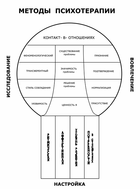 Четыре сферы человеческого функционирования – аффективная, поведенческая, когнитивная и физиологическая являются важными ориентирами в определении открытых или закрытых каналов к контакту и, тем самым, к терапевтической поддержке. Основная задача интегративной психотерапии состоит в использовании терапевтических отношений, в способности создать контакт в настоящем как «мостик» к удовлетворяющим отношениям с другими и цельному, наполненному «Я».