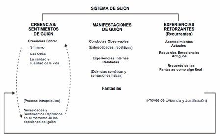 El Sistema de Guión ofrece un modelo para entender las dinámicas sistemáticas entre las dimensiones intrapsíquicas, conductuales y fisiológicas del Guión de Vida. El Sistema de Guión diseña y correlaciona cómo las reacciones intrapsíquicas (conclusiones y decisiones defensivas) y las introyecciones que conforman el núcleo del Guión de Vida, se organizan en creencias de guión; cómo estas creencias centrales se manifiestan en conductas, fantasías y tensiones fisiológicas; y cómo un individuo estructura sus percepciones y sus interpretaciones de las experiencias para otorgar refuerzo a las creencias de guión (Erskine, 1994/1997c, p. 57).
